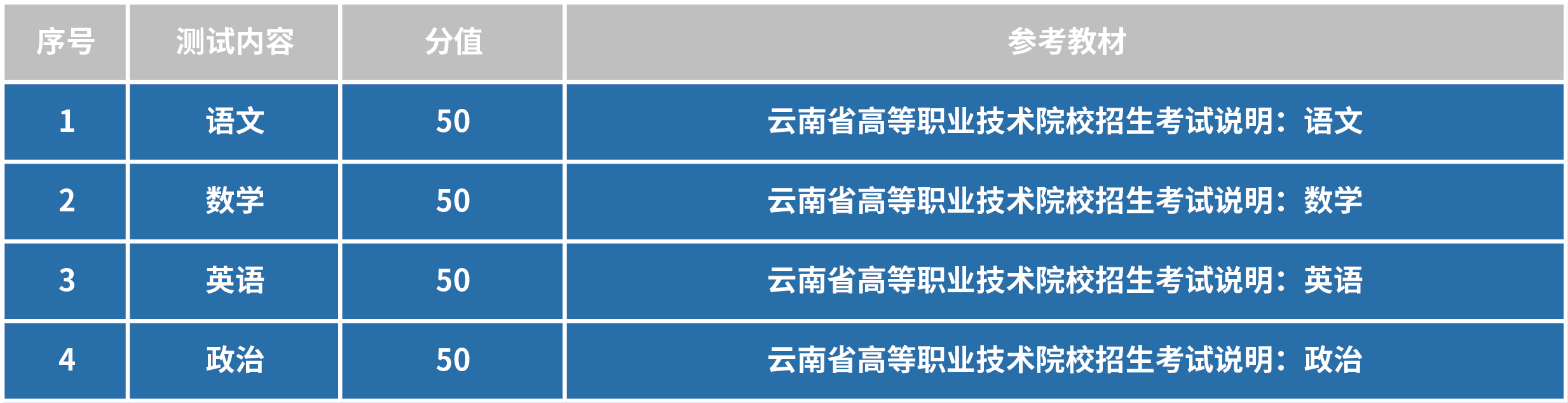 本次考試公共基礎(chǔ)課測試內(nèi)容為語文、數(shù)學、英語、政治等四個部分,每個部分的分值為50分。本次考試不指定考試用書,只推薦參考教材(見下表)。