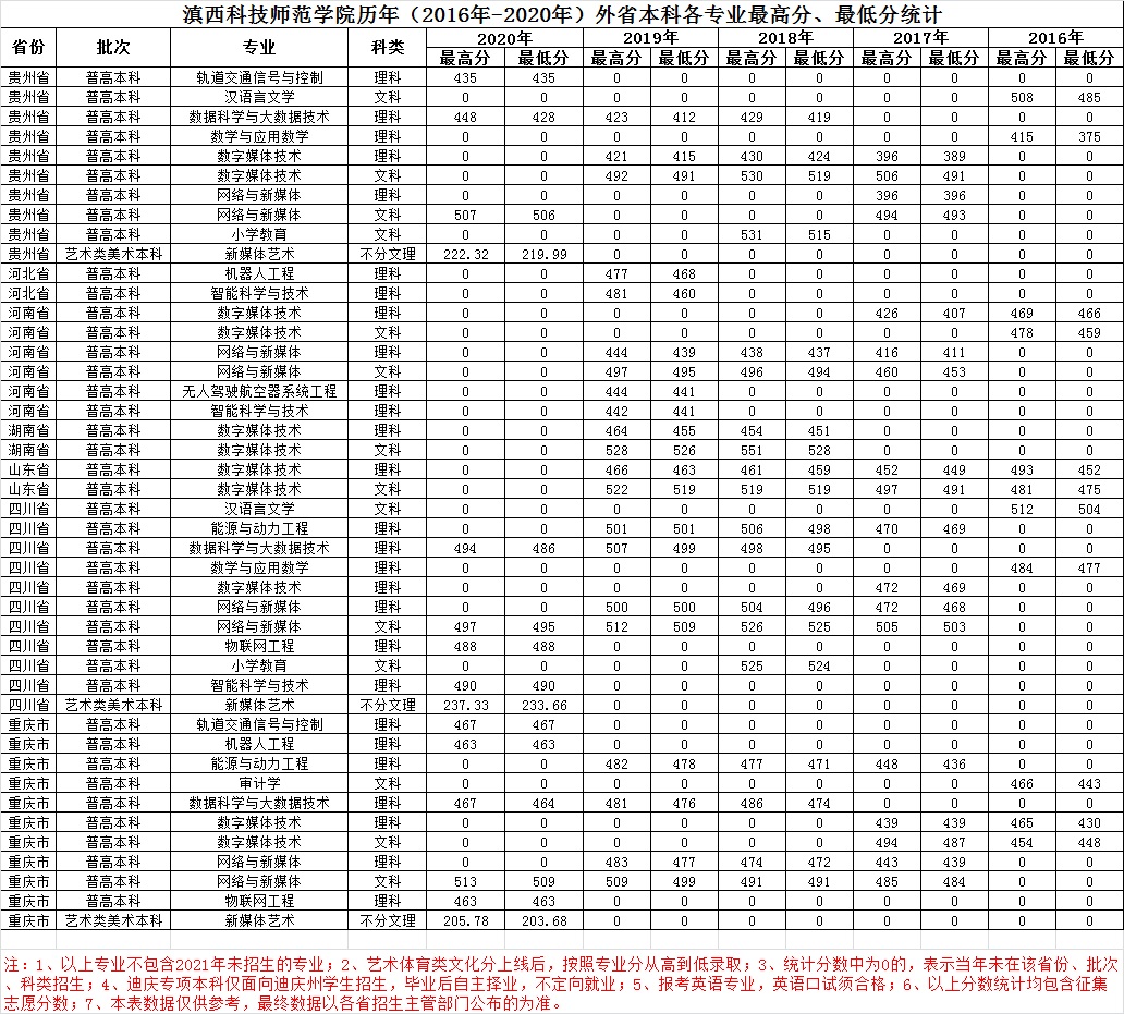 滇西科技師范學院歷年(2014-2020)分省、類別、專業錄取分數線統計(高清PDF點此下載)