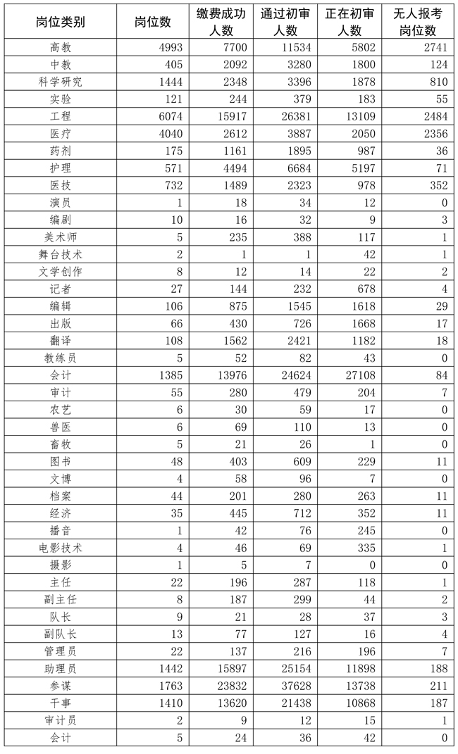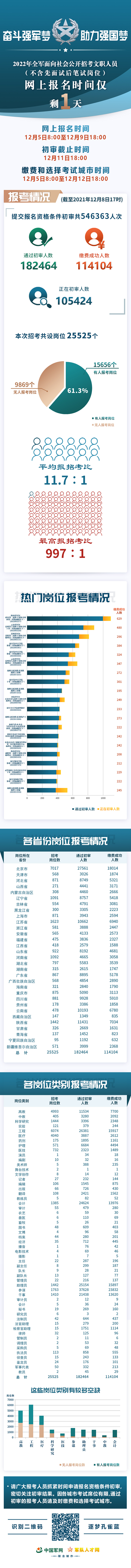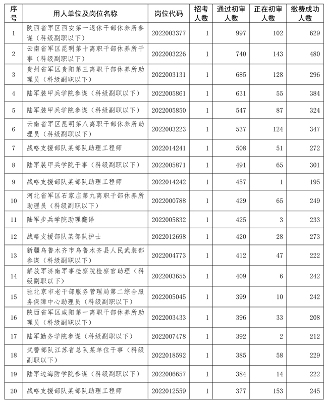 2022年全軍面向社會公開招考文職人員(不含先面試后筆試崗位)網(wǎng)上報名火熱進行中。截至12月8日17時,提交報名資格條件初審共546363人次,通過網(wǎng)上報名資格條件初審的報考人員182464人,繳費成功的報考人員114104名,用人單位正在進行報名資格條件初審的報考人員105424人。有人報考的崗位15656個、占61.3%,平均報招考比為11.7:1,最高報招考比為997:1。此次招考網(wǎng)上報名時間還剩最后1天,請廣大報考人員抓緊時間申請報名資格條件初審,密切關注初審結果。因各城市考試席位有限,通過初審的報考人員請及時繳費和選擇考試城市。相關招考崗位報考情況如下: