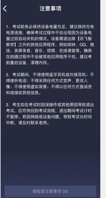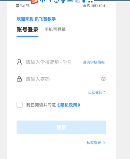 1.考生于考試前15分鐘打開手機訊飛智教學APP,輸入登錄賬號和密碼,點擊“我已閱讀并同意《隱私政策》”點擊“登錄”。