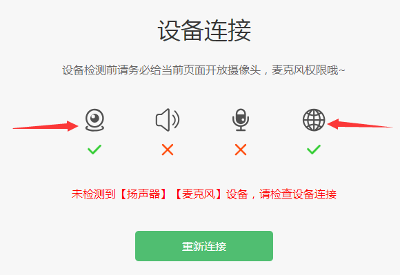 臺式電腦保證攝像頭和網絡正常。筆記本應該全部顯示正常連接。