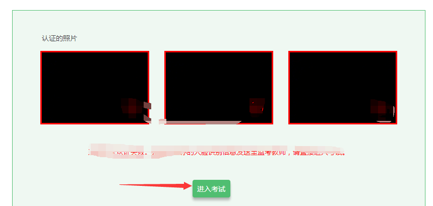 8.點擊“進入人臉識別”,點擊“拍照”。如人臉匹配成功,則可進入考試。三次匹配不成功則自動保存異常記錄,監考教師會根據考生實際情況判定該生是否可以參加考試,此過程中考生須全程配合相關操作,否則不可參加考試。