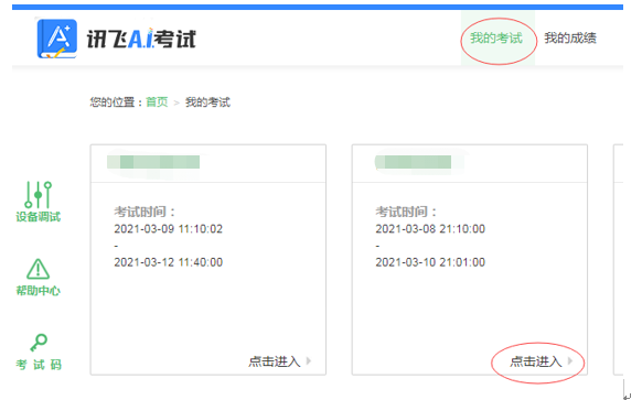 5.點擊進入訊飛AI考試(在線)后,在“我的考試”頁面中選擇對應的考試。