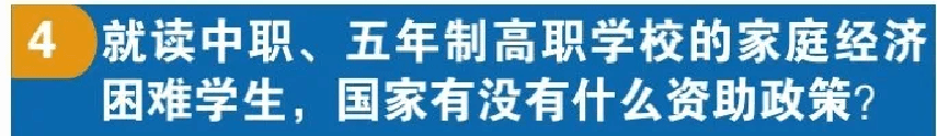 答:對就讀中職、五年制高職院校的全日制在校家庭經濟困難學生,前三年按照中職學校的資助政策執行。可申請國家獎學金、省政府獎學金、國家助學金和免學費。