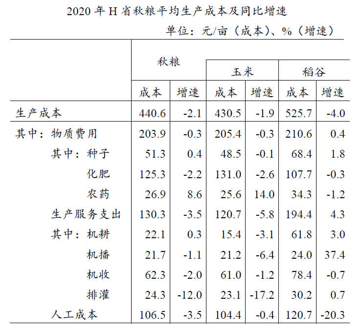 2020年,H省秋糧玉米和稻谷的市場平均交易價格分別為2.34元/公斤和2.74元/公斤,分別比上年上漲28.6%和8.7%。按此價格測算,2020年全省農戶種植玉米、稻谷扣除成本前的產值分別為957.1元/畝、1520.7元/畝,分別比上年增長33.4%、8.9%。