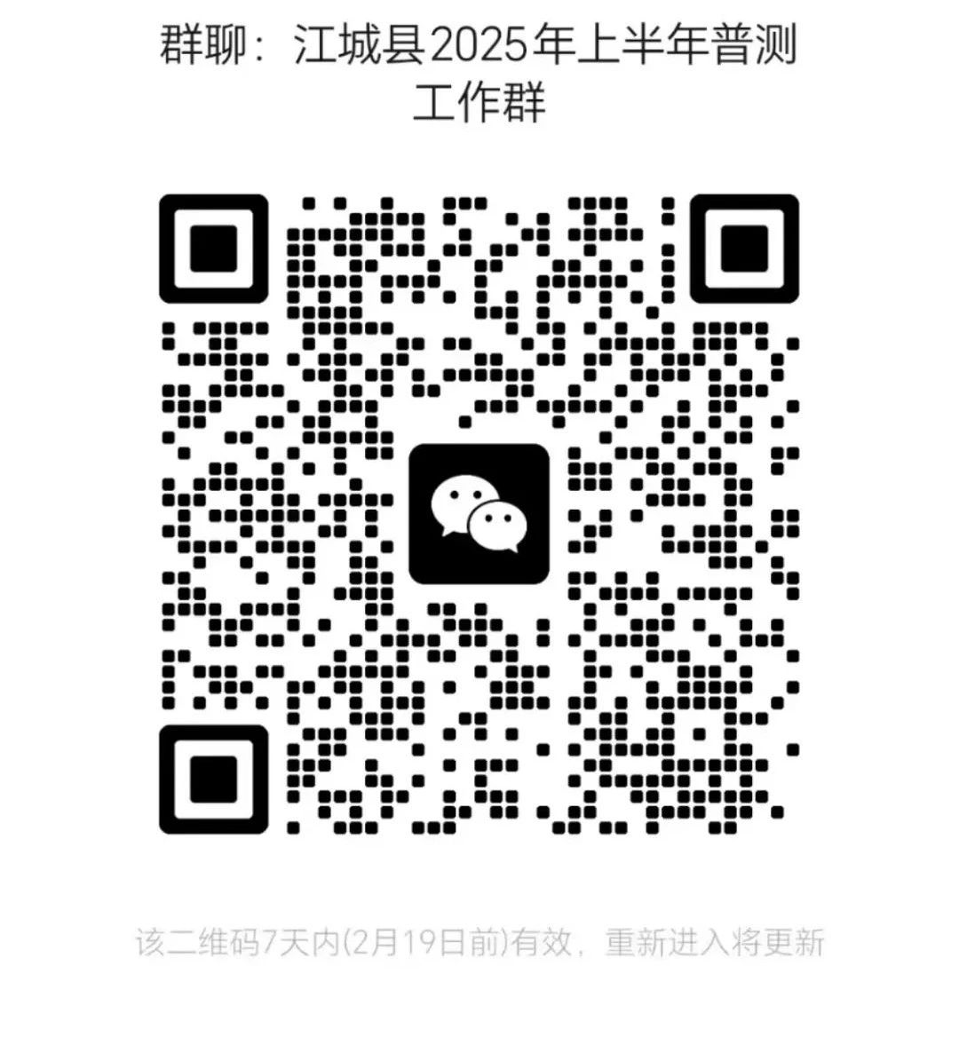 4.線上報名完成后,請及時微信掃碼進(jìn)入“江城縣2025年上半年普測群”,實時關(guān)注群公告及動態(tài)。