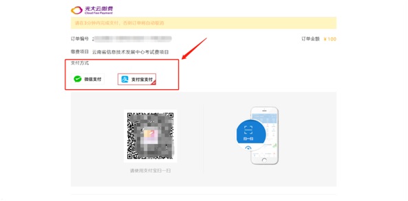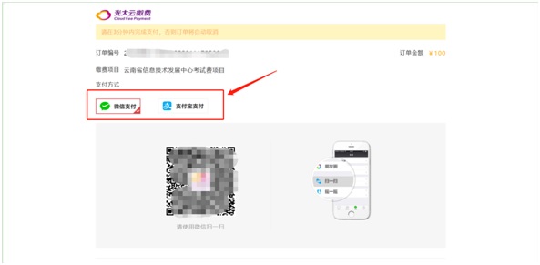 3、進入光大云繳費界面,選擇“微信支付”或“支付寶支付”,掃碼支付: