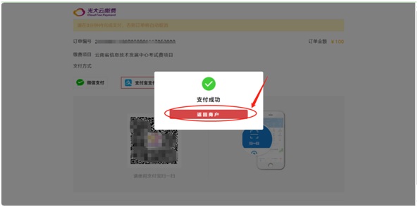 4、支付成功,會出現“支付成功”提示,點擊“返回商戶”回到報名系統。