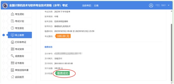5、報名系統中“網上繳費”界面,顯示“繳費成功”。