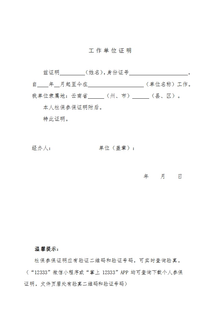 2.實際工作地在單獨劃線地區的工作單位證明(必須包括姓名、身份證號、工作單位及工作所在地地址等,樣表在www.ynxr.com云南軟考網2025年上半年報名通知附件下載)、本人在單獨劃線地區社保參保證明(加蓋單位公章)。社保參保證明應有驗證二維碼和驗證號碼,可實時查詢驗真。(“12333”微信小程序或“掌上12333”APP均可查詢下載個人參保證明,文件頁眉處有驗真二維碼和驗證號碼)