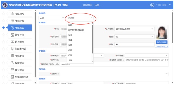 2、點選左側相應欄目查看考生須知、考試計劃等。點選“考試報名”,進入報名界面,進行信息填寫(先選擇“報名省市”,選擇就近地區,當次報考資格等詳細說明在“考生須知”中查閱):