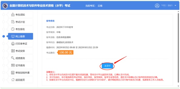 1、報名審核通過后,點擊左側“網上繳費”,進入繳費界面,核對報名信息無誤后,點擊“去支付”: