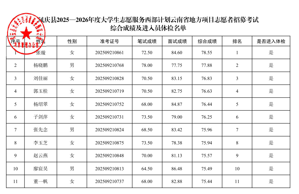 鳳慶縣2025-2026年度云南省大學生志愿服務西部計劃地方項目志愿者招募面試相關工作已結束,根據(筆試成績+面試成績)×50%計算,現將綜合成績及體檢事宜公告如下: