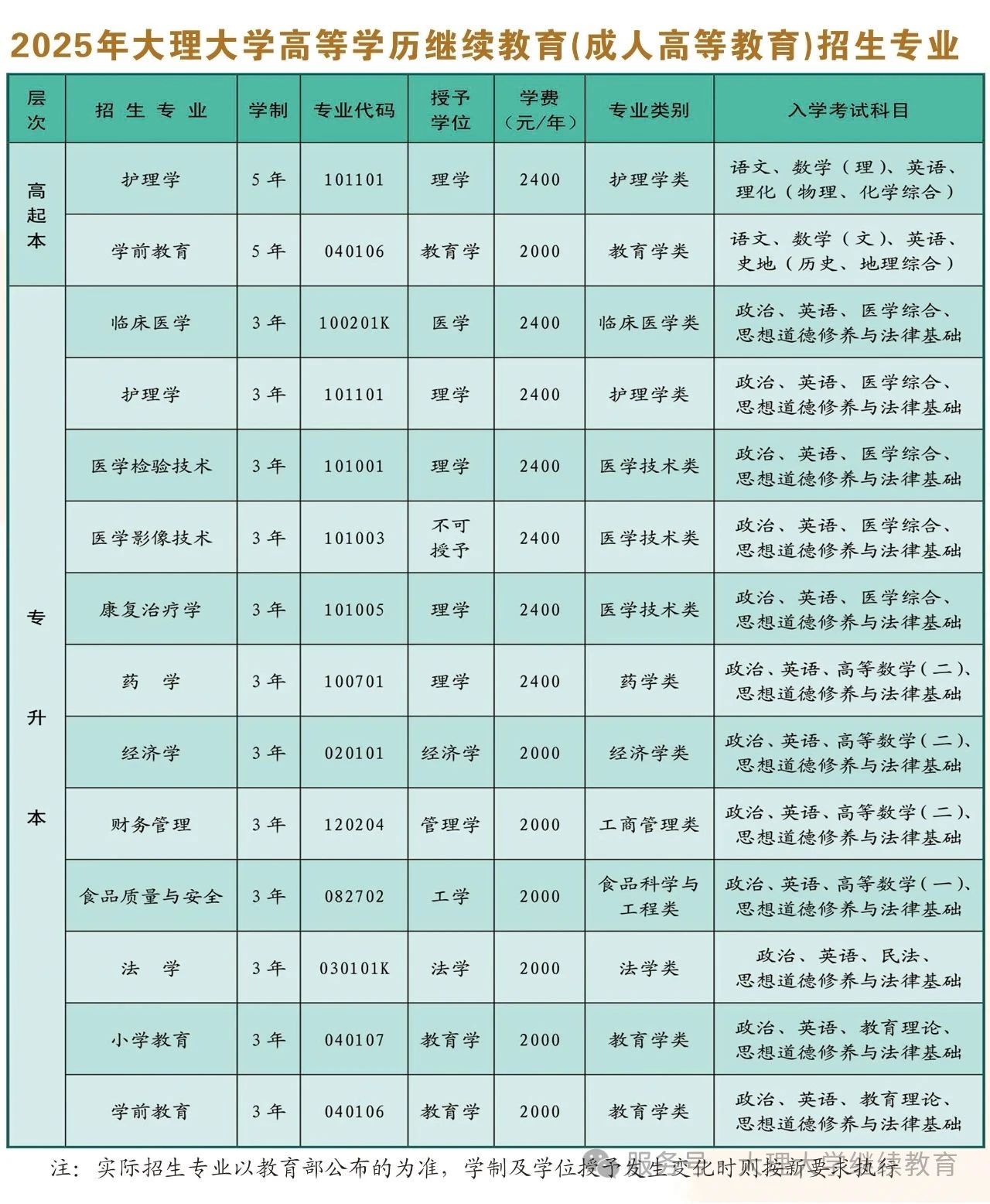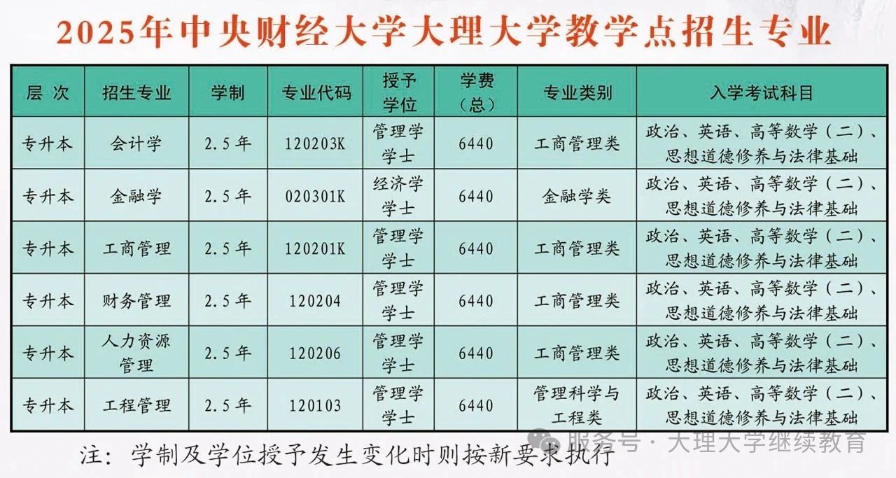 大理大學2025年高等學歷繼續教育(成人高等教育)報考指南