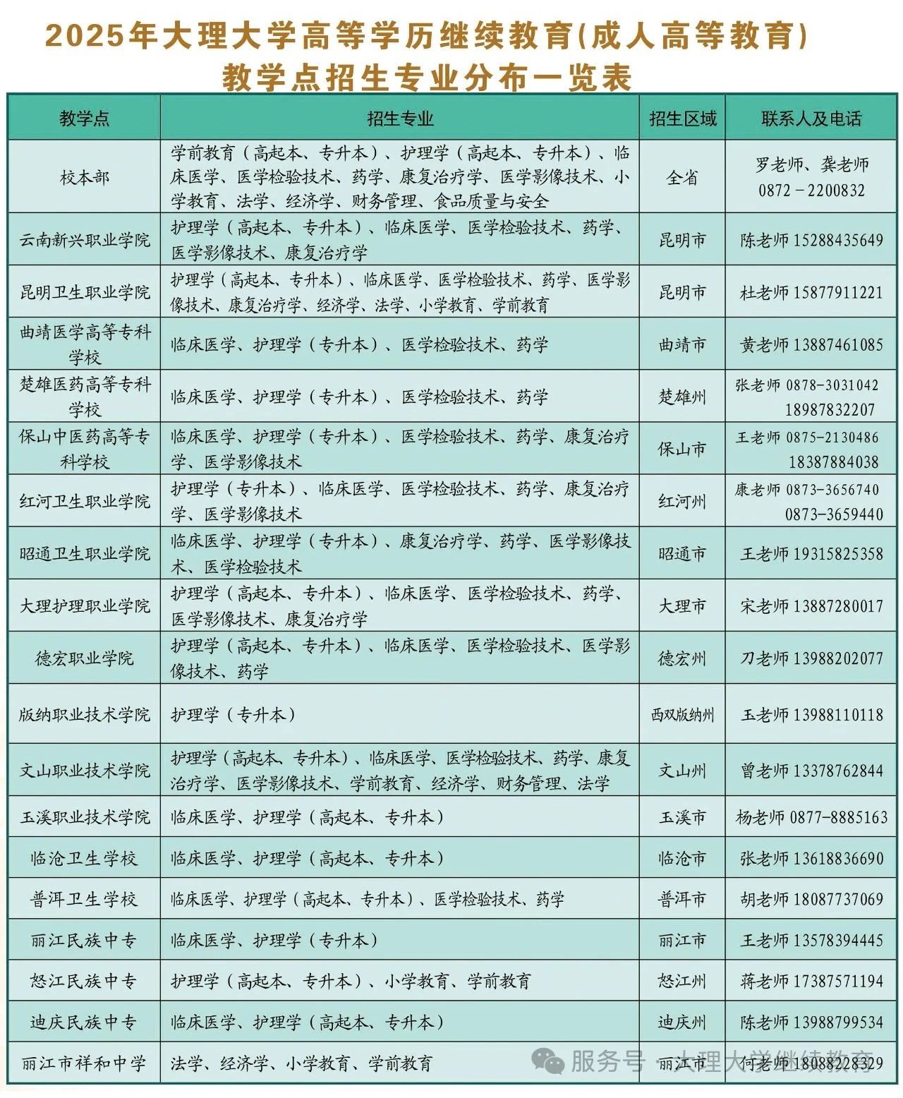 考生可通過電話、大理大學繼續教育微信公眾號、或到校本部和校外教學點現場報名咨詢及報名信息登記(校本部和校外教學點聯系方式詳見2025年大理大學高等學歷繼續教育(成人高等教育)招生專業教學點分布一覽表)。