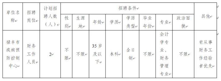 經(jīng)報請祿豐市衛(wèi)生健康局、祿豐市緊密型醫(yī)共體同意,祿豐市疾病預(yù)防控制中心面向社會公開招聘事業(yè)單位編制外財務(wù)工作人員2人,現(xiàn)將有關(guān)事項公告如下: