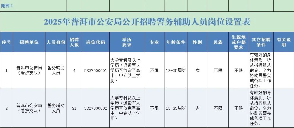附件: 1.2025年普洱市公安局公開(kāi)招聘警務(wù)輔助人員崗位設(shè)置表