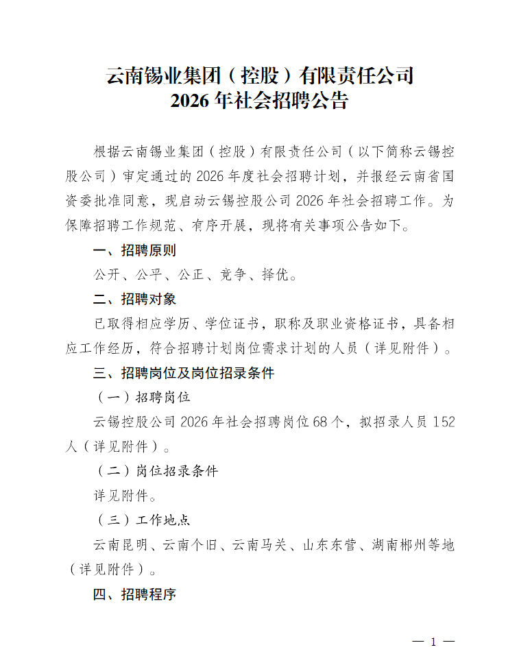 附件【附件:云南錫業(yè)集團(控股)有限責任公司2026年社招計劃崗位明細表 .pdf】 來源:https://www.ytc.cn/info/1226/15912.htm