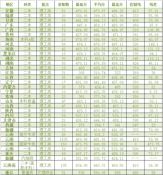 西南林業大學2017年全國各省份理工類錄取情況表