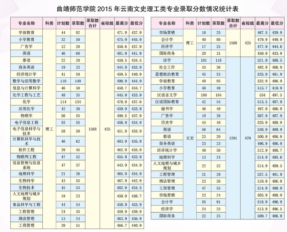 曲靖師范學院2015年云南文史理工類專業錄取分數情況統計表