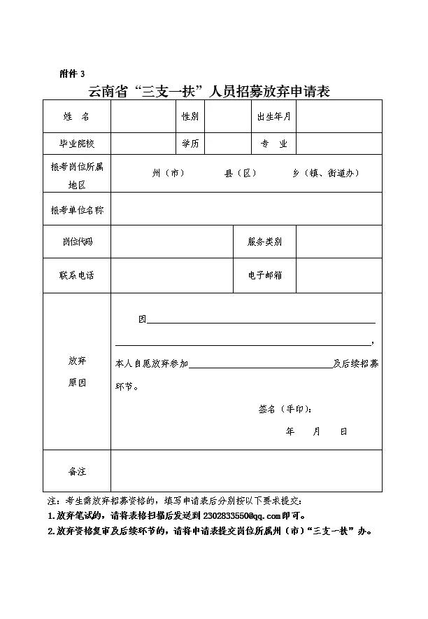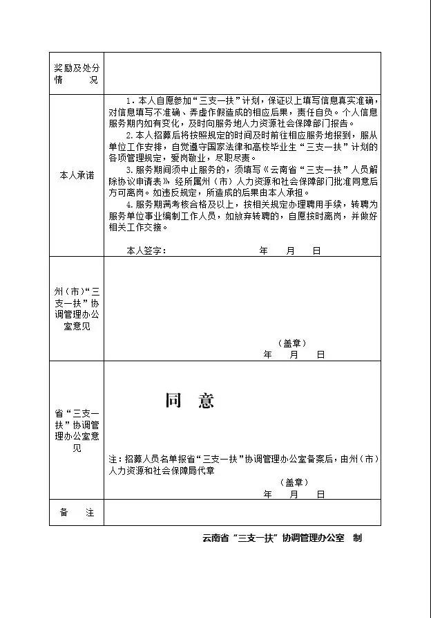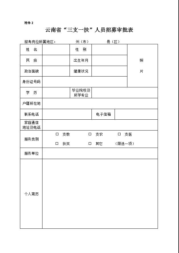 (2)《云南省“三支一扶”人員招募審批表》一式四份(在本公告附件中下載,按說明填寫后,雙面打印并貼近期免冠一寸白底彩照);