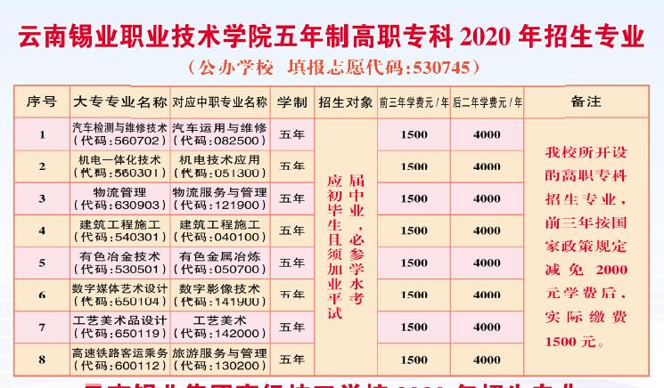 云南錫業(yè)職業(yè)技術(shù)學(xué)院五年制高職專科2020年招生簡章